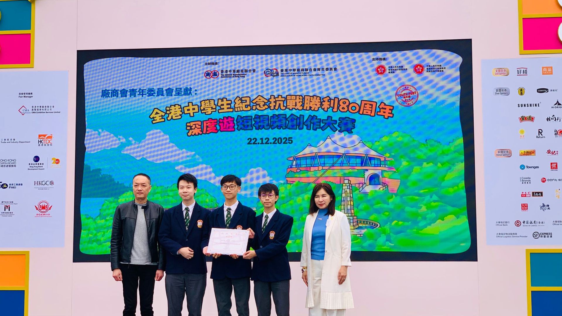 學生大使剪片組同學於全港中學生「紀念抗戰勝利 80 周年」深度遊短視頻創作大賽中獲得「高中組優異獎」!頒獎典禮已於第 59 屆工展會舞台舉行。