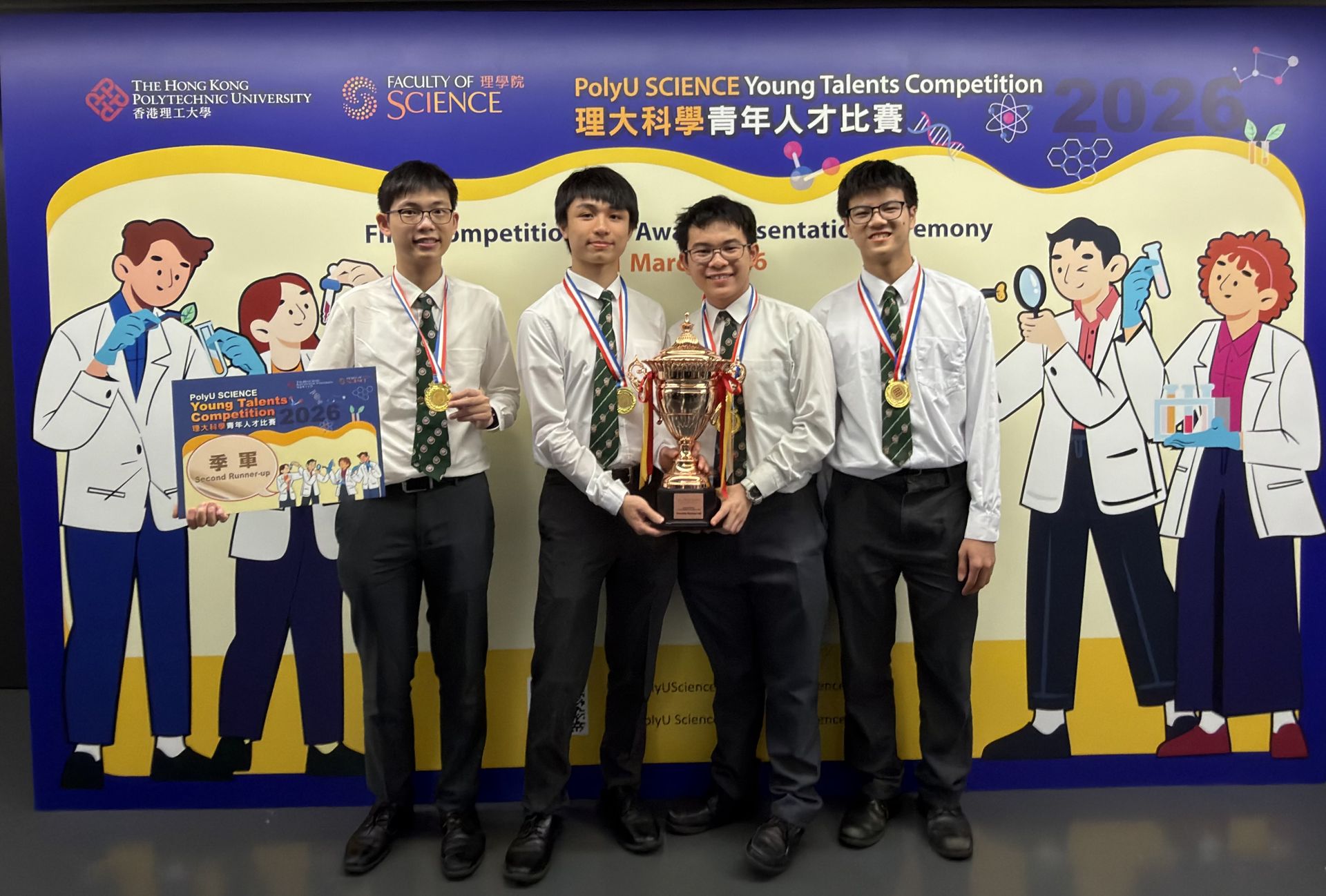 Congratulations to Lien Ho Ting ( 4D ), Chau Tsz Sum ( 4E ), Cheung Ka Wing ( 5E ), and Tsang Marcus ( 5F ) for winning 2nd Runner-up at the PolyU Science Young Talents Competition 2026!